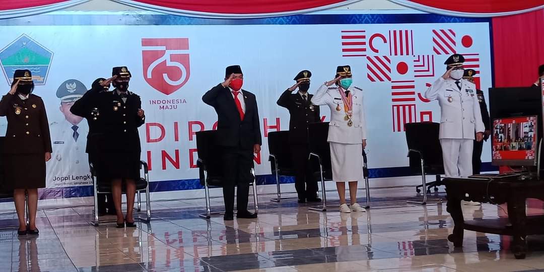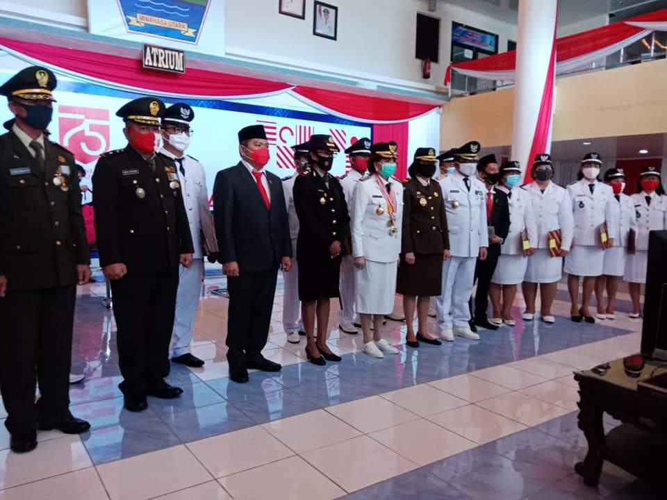 AIRMADIDI, viralberita.net — Bupati Kabupaten Minahasa utara DR Vonnie Anneke Panambunan S.th (VAP) didampingi Wakil bupati Joppy Lengkong mengikuti upacara detik-detik Proklamasi kemerdekaan ke-75 tahun di Istana Negara Republik Indonesia (RI) melalui virtual, senin 17 agustus 2020 di Atrium kantor Bupati Minahasa utara.