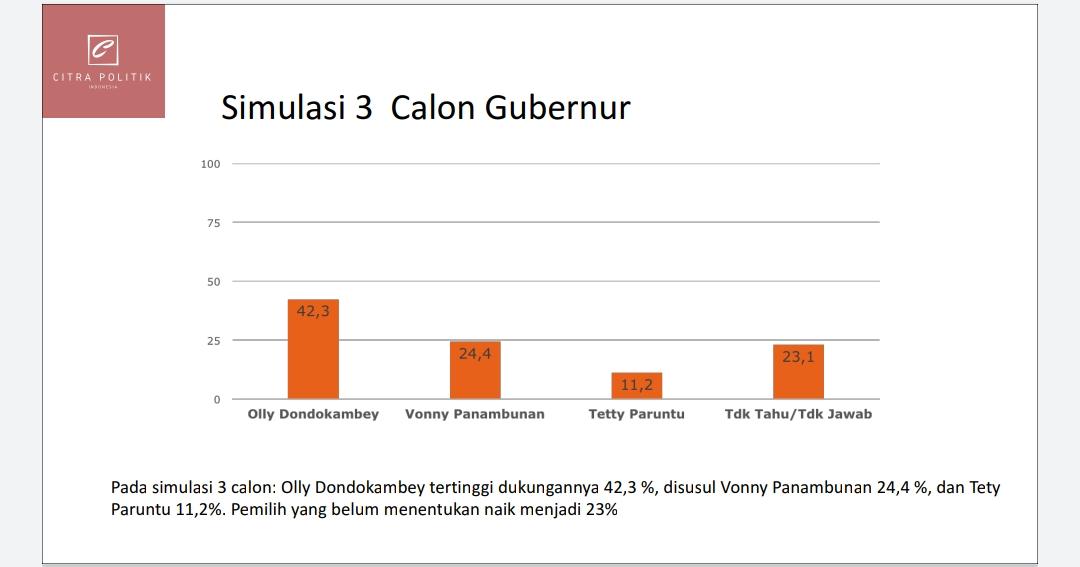 Dari hasil survei di Sulut pertengahan bulan Agustus 2020, Citra Politik Indonesia menemukan dua calon Gubernur Sulut yang berpotensi memenangkan Pilkada Sulut, yakni: Olly Dondokambey SE (42,2%) dan Dr (HC) Vonnie Anneke Panambunan STh (24,4%).