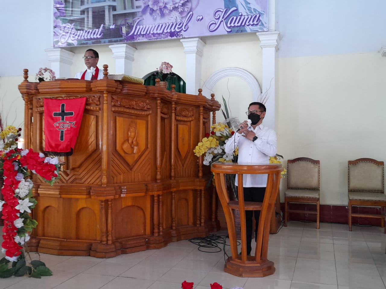 MINUT, VIRALBERITA.NET — Bupati Minahasa utara Joune Ganda, SE hadir beribadah di jemaat Imanuel Kaima Wilayah Minawerot, Minggu 29 Agustus 2021.