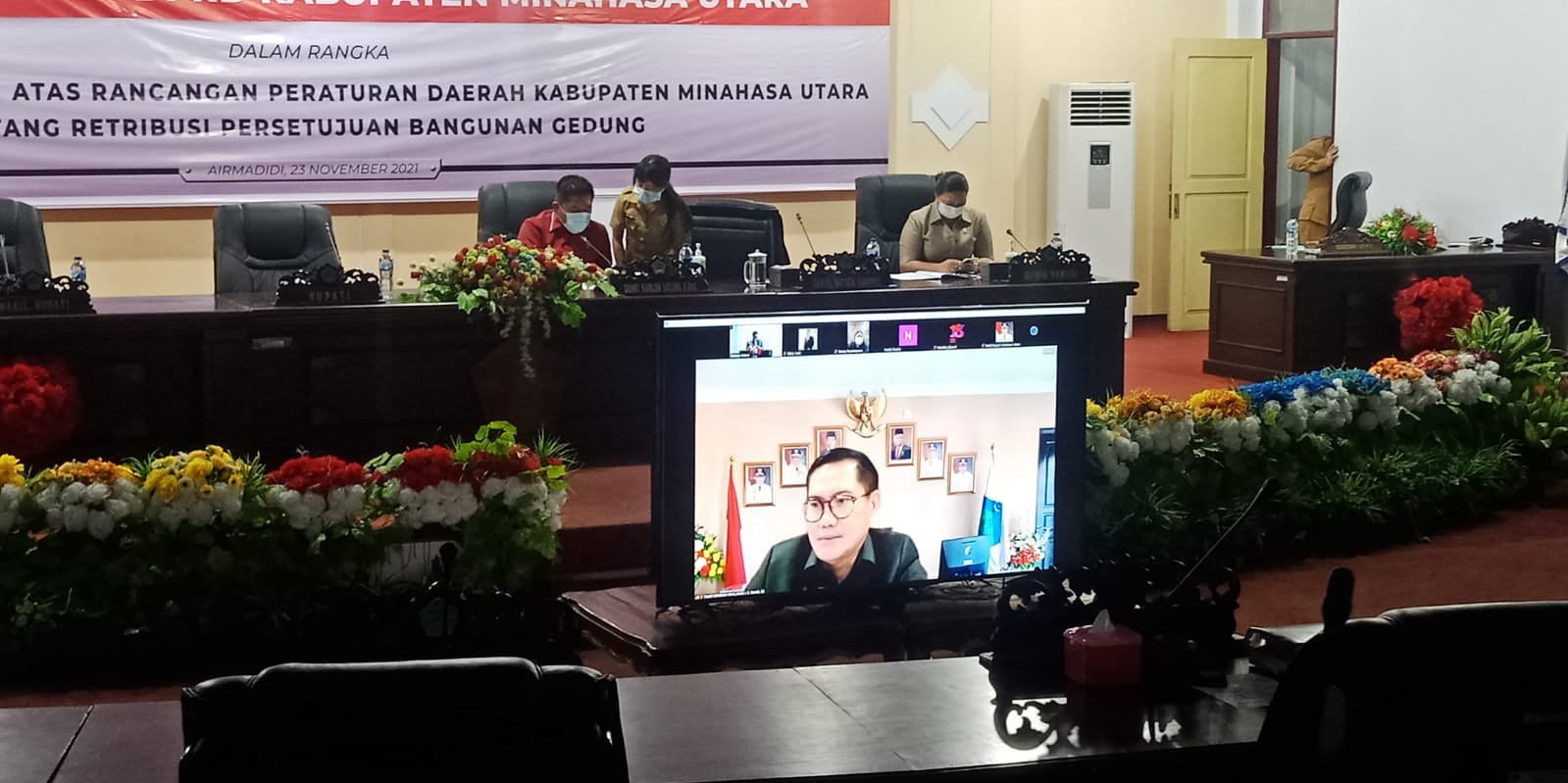 Hasil pembahasan Panitia khusus (Pansus) Ranperda tentang retribusi PBG yang disaksikan langsung Bupati Minahasa utara Joune Ganda, SE dan Wakil Bupati Kevin Wiliam Lotulung, SH.MH melalui video conference yang dibacakan Ketua Pansus H Sahran Antili menyampaikan Perda PBG ini dibuat guna mencabut Perda Nomor 1 Tahun 2018 tentang retribusi daerah dan menyesuaikan dengan perkembangan hukum yang berlaku saat ini UU nomor 11 tahun 2020 tentang hak cipta kerja.