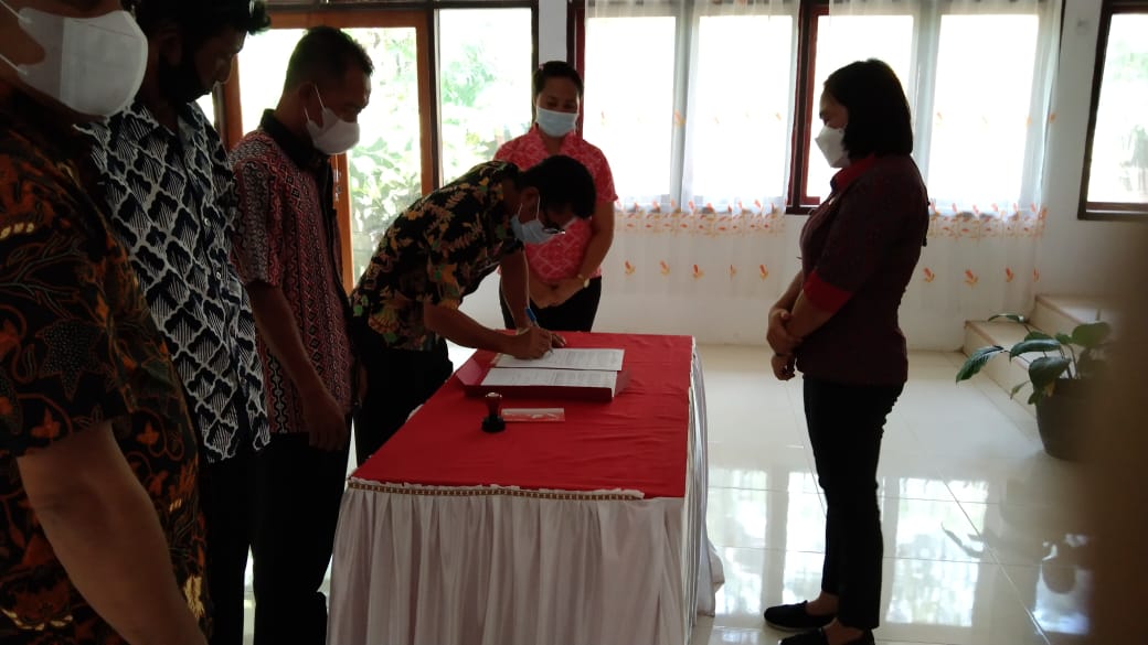 Dihadapan Camat dan semua yang hadir, Nikodemus Oleh menyerahkan cap desa, buku rekening desa, register desa serta aset dan inventaris desa Kinunang kepada Hanses Sangkilang.