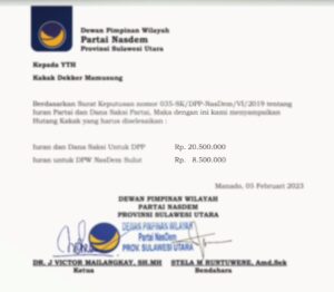 “Buktinya NasDem Mitra lolos di Sipol KPU Mitra saat Vermin KPU, itu artinya kami serius membesarkan NasDem Mitra. Kemudian pembentukan DPRt di 135 desa Dan 9 kelurahan se-Mitra yang menghasilkan ribuan kader militan, nah masalah kami dimana? Sehingga kami diganti?. Sementara ketua yang diangakat ini tidak punya komitmen dalam membesarkan partai, buktinya tidak menyetor iuran (sambil menunjukkan bukti yang memang ada tanda tangan Ketua dan Bendahara DPW NasDem Sulut) ke partai sebagai anggota DPRD setahun lebih ini. Padahal ini diperintahkan lewat SK Ketum partai” sebutnya.