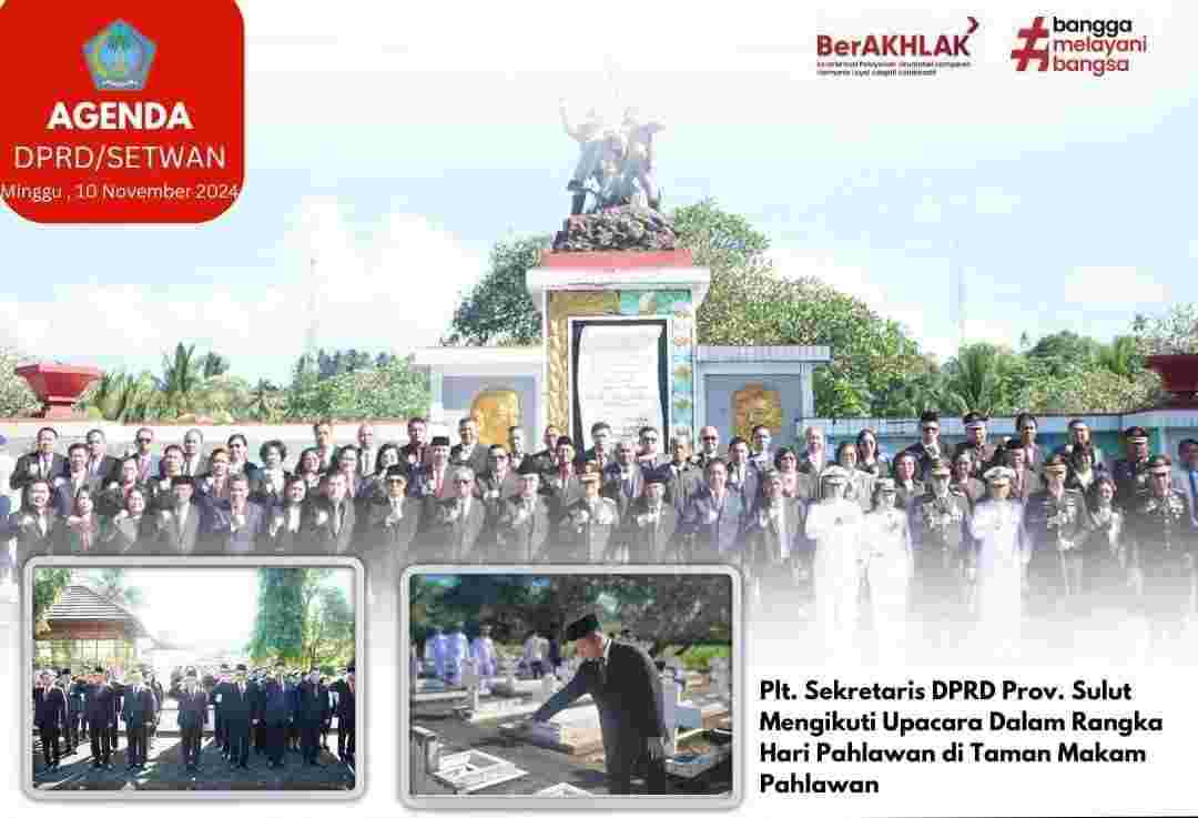 SULUT – Plt.Sekretaris DPRD Sulut, Niklas Silangen menghadiri Upacara Peringatan Hari Pahlawan 10 November 2024 dijajaran Pemerintah Provinsi Sulut yang di pusatkan di Tamam Makam Pahlawan Kairagi Manado.