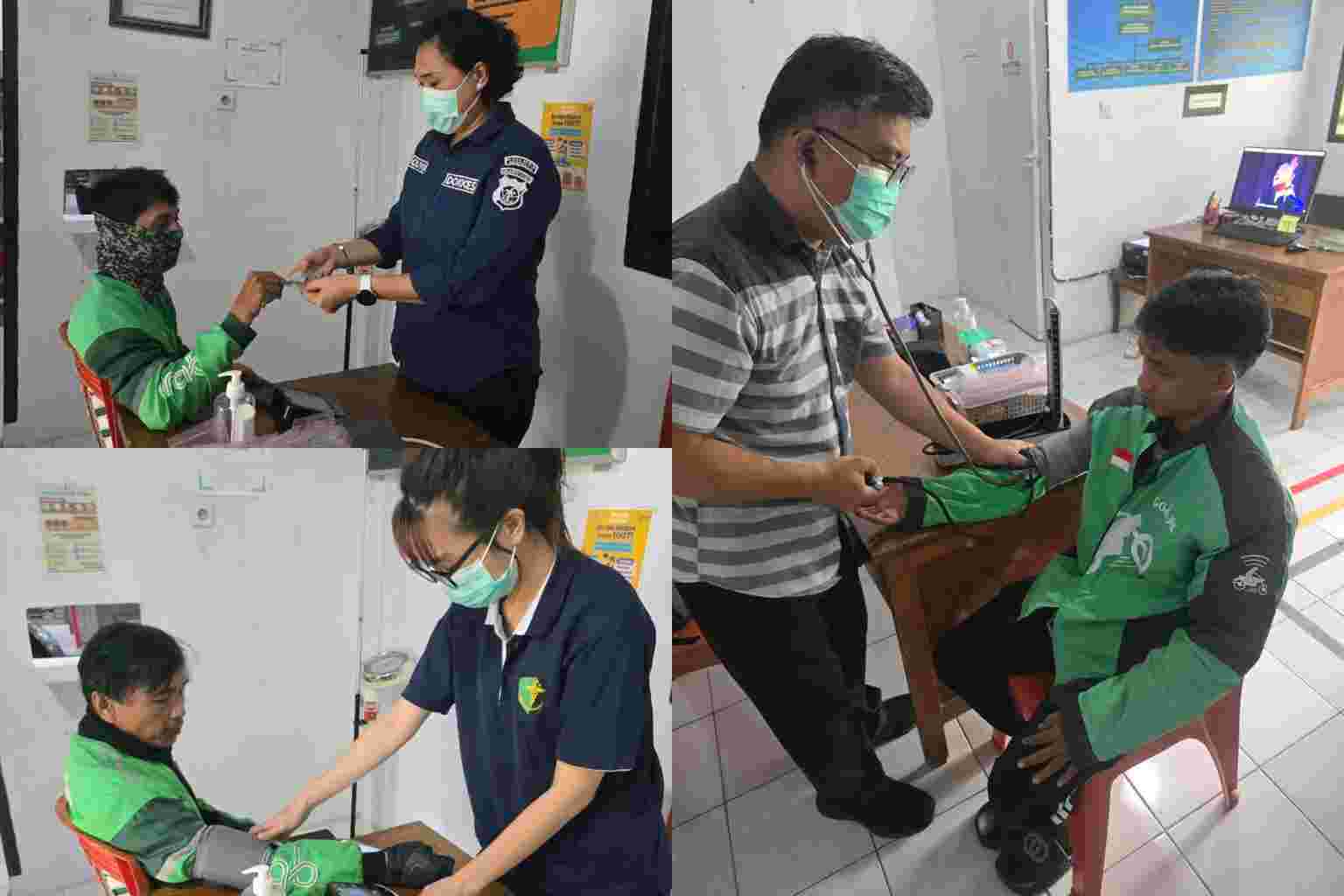 Anggota Si Dokkes Polres Minut memberikan berbagai layanan kesehatan, meliputi pengecekan tekanan darah, pemeriksaan laboratorium mini (kolesterol, asam urat, dan glukosa), serta pemberian vitamin dan terapi obat bagi driver ojol yang membutuhkan.