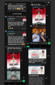 Minut, viralberita.net — Dihari istimewa orang Nomor satu di Minahasa utara khususnya di Whatsapp Group Perusahaan Umum Daerah (PUD) KLABAT dibanjiri ucapan selamat ulang tahun kepada Bupati Minahasa utara Joune JE Ganda, SE. MAP. MM. MSi yang ke 54 tahun dari Direksi dan karyawan, minggu 27 Juli 2025.