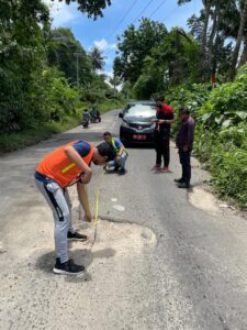 PEDULI : Tampak Camat Ratahan Arce Kalalo saat mendamping tim PUPR melakukan pengukuran kerusakan jalan dari Plaza-Desa Rasi. MITRA, VIRALBERITA.NET-kepala Kecamatan (Camat)
