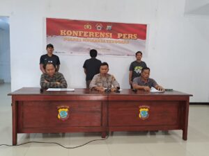 Press Rilis: Tampak Wakapolres Kompol Aidit Djafar, S.H.,M.H. didampingi Kasat Reskrim Iptu Ahmad Muzaki,S.I.K, Kasat Intelkam Iptu Suparlan saat menggelar konferensi pers