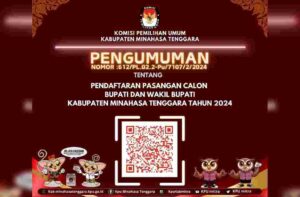 Mitra, viralberita.net — Komisi Pemilihan Umum (KPU) Kabupaten Minahasa Tenggara (Mitra) mengumumkan pendaftaran bakal pasangan calon Bupati dan Wakil Bupati Minahasa Tenggara
