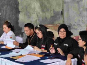 Serius : Tampak Kordiv P3S Bawaslu Mitra Dolly Van Gobel didampingi Panwascam Kecamatan Pasan melakukan monitoring pleno terbuka DPHP yang dilaksanakan oleh