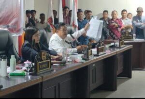 PANAS: Tampak Wakil Ketua DPRD Tonny Lasut, saat mengingatkan agenda tahapan paripurna di sela-sela keributan antara Fraksi. Mitra, viralberita.net- DPRD Kabupaten Minahasa