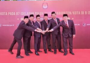 SOLID: Tampak lima anggota komisioner KPU Mitra foto bersama usai dilantik. Mitra viralbeita.net-Ketua Komisi Pemilihan Umum Republik Indonesia (KPU RI) Hasyim Asy’ari