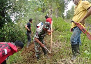 MINAHASA – Bintara Pembina Desa (Babinsa) Koramil 1302-07/Tombariri Sersan Kepala ( Serka ) Frangky Wehantow dibantu warga setempat membangun saluran air di