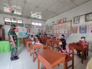 MINAHASA – Beri pemahaman tentang Bela Negara kepada para siswa Sekolah Dasar, Bintara Pembina Desa (Babinsa) Koramil 1302-10/Sonder Sersan Satu (Sertu) Sumarno