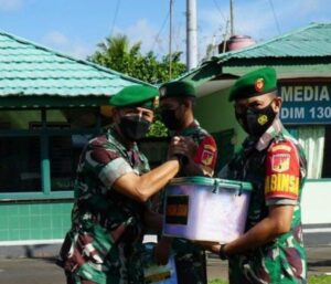 MINAHASA – Komandan Kodim (Dandim) 1302/Minahasa Letkol Inf Ircham Effendi secara simbolis menyerahkan bingkisan dari Kepala Staf Angkatan Darat Jenderal TNI Dudung