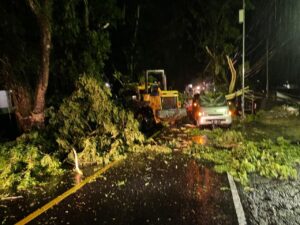 MINUT, VIRALBERITA.NET — Hujan dan badai melanda Minahasa Utara hanya sekejab saja pohon ditepi jalan raya Manado Bitung tepatnya di Desa Kolongan