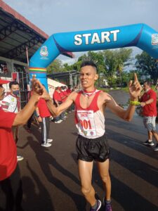 Manado – Bintara jasmani Korem 131 Santiago Serda Herlanto Raego berhasil meraih juara 1 lomba lari 10k Chrismas Manado Run 2021 yang