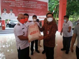 MINUT, VIRALBERITA.NET — Bupati Minahasa Utara Joune Ganda SE, menyerahkan secara simbolis cadangan pangan bagi keluarga miskin dan anak yang mengalami stunting