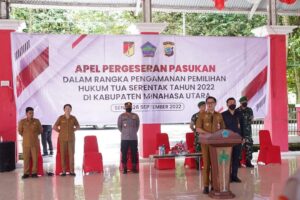 MINUT, VIRALBERITA.NET — Pemerintah Kabupaten Minahasa utara menggelar Apel Pergeseran Pasukan Dalam Rangka Pengamanan dan Penyerahan Logistik Pemilihan Hukum Tua (Pilhut) Tahun